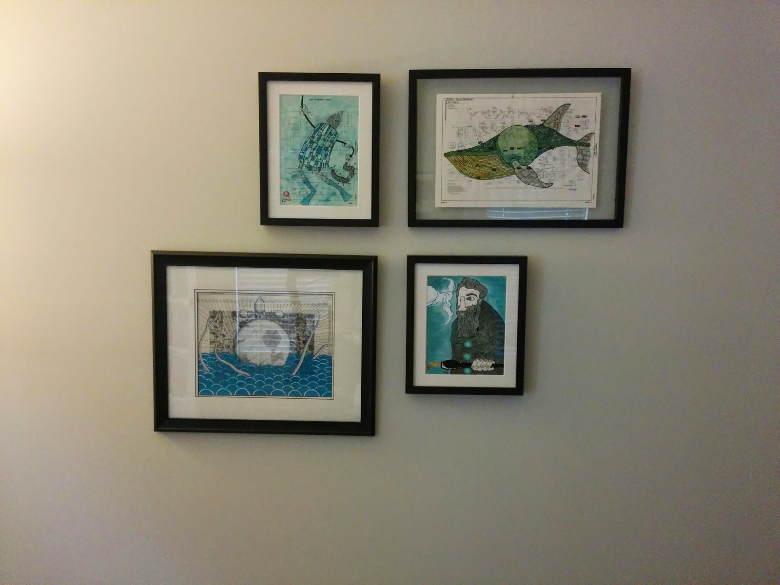 As you know, my art is very dear to me, so I enjoy seeing when others have had my work framed and hung on their own walls. This particular friend has quite a few of my works (maybe more than anyone else, possibly excepting my good friend Brian S.) so I know that these pieces are in very very good hands. Many of these go back several years, all the way back to the original Moby-Dick project, while some are newer and one is a brand new commission. I like these photos very much.